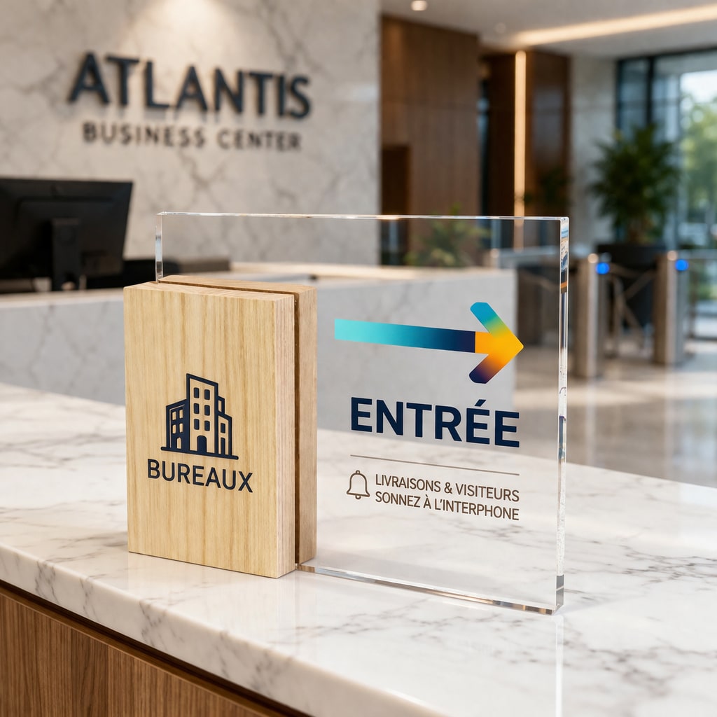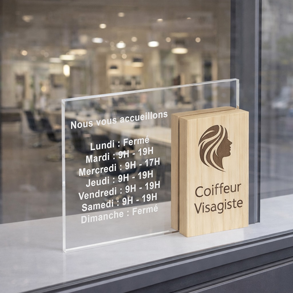 Ainsi, cette association de matériaux permet de créer un contraste visuel fort, idéal pour capter l’attention. Que ce soit sur un comptoir d’accueil, une vitrine ou un bureau, la plaque devient immédiatement un élément distinctif.