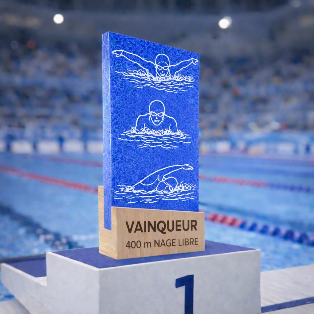 Ensuite, le marquage peut être réalisé par gravure laser, offrant un rendu fin, précis et intemporel. Cependant, il est également possible d’opter pour une impression couleur, idéale pour intégrer des logos, des visuels ou des designs plus complexes. Mieux encore, ces deux techniques peuvent être combinées sur un même trophée, permettant ainsi de créer un rendu unique et particulièrement impactant.