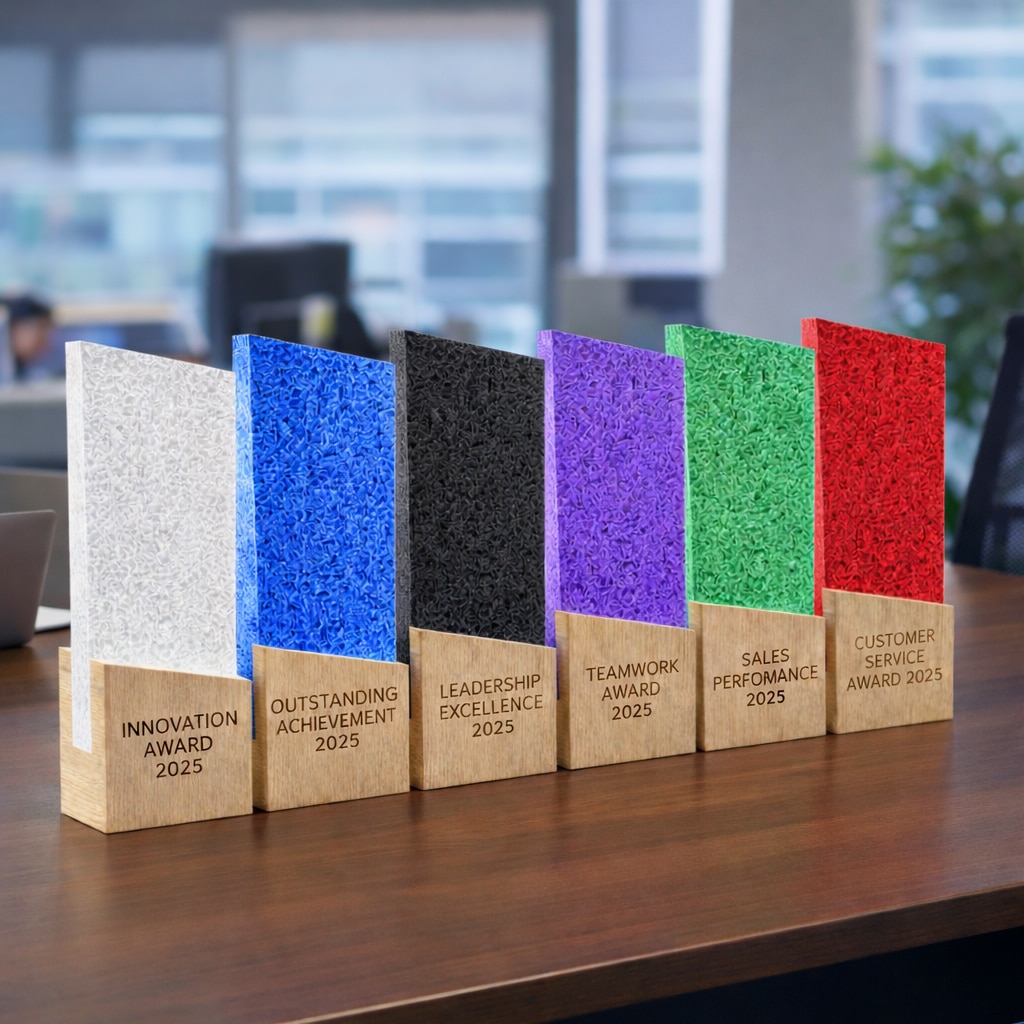 Par ailleurs, le plexiglas recyclé peut être teinté selon vos préférences. Cela ouvre la voie à une personnalisation encore plus poussée, en accord avec les couleurs de votre entreprise ou de votre événement. Par conséquent, chaque trophée devient une pièce sur mesure, véritable reflet de votre image.