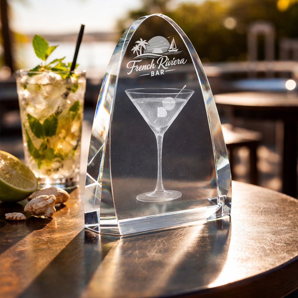 Grâce à sa surface parfaitement polie, la gravure laser dans le verre optique offre un rendu précis et raffiné. De ce fait, logos, textes ou noms des lauréats apparaissent avec une grande finesse, transformant ce trophée en un souvenir unique et prestigieux.
