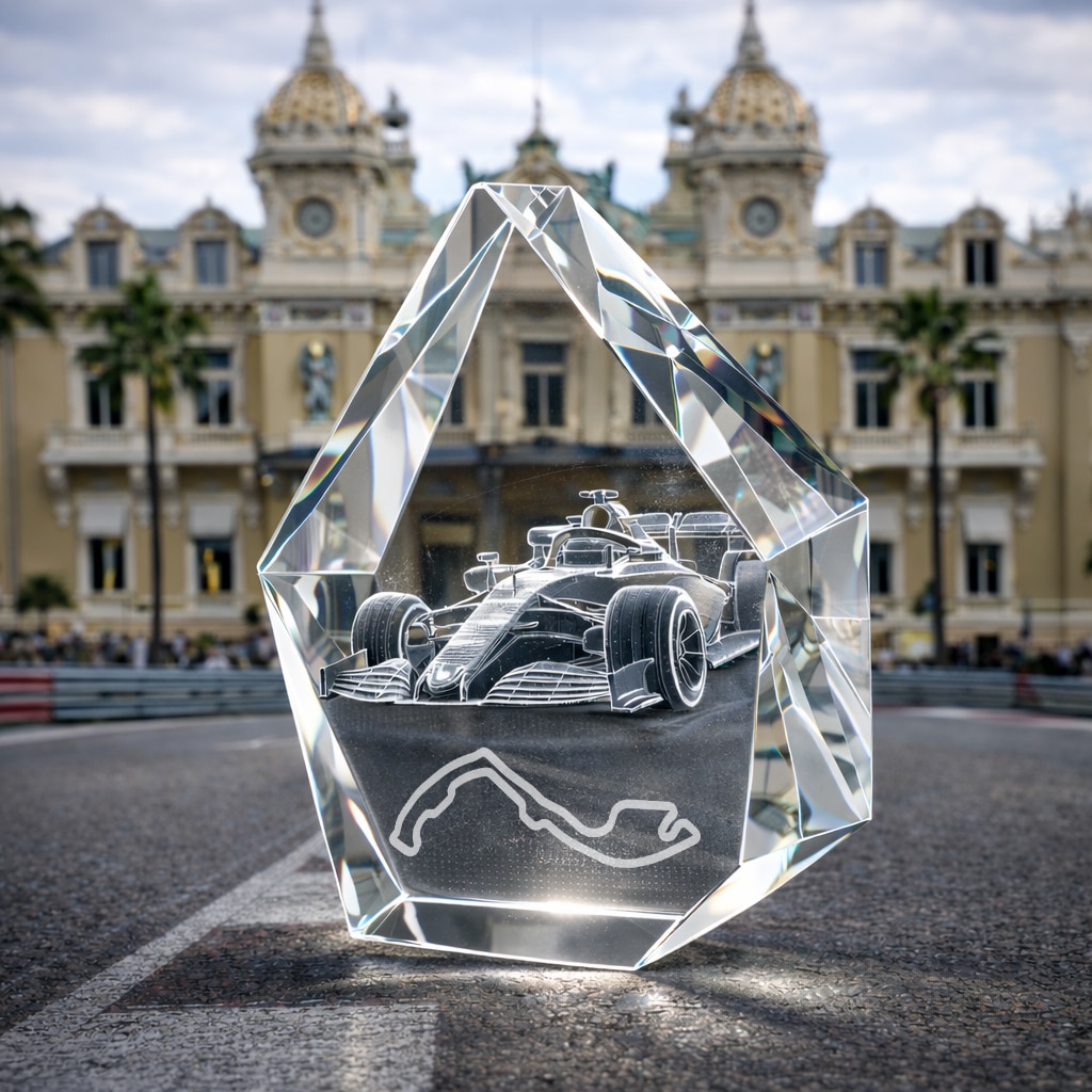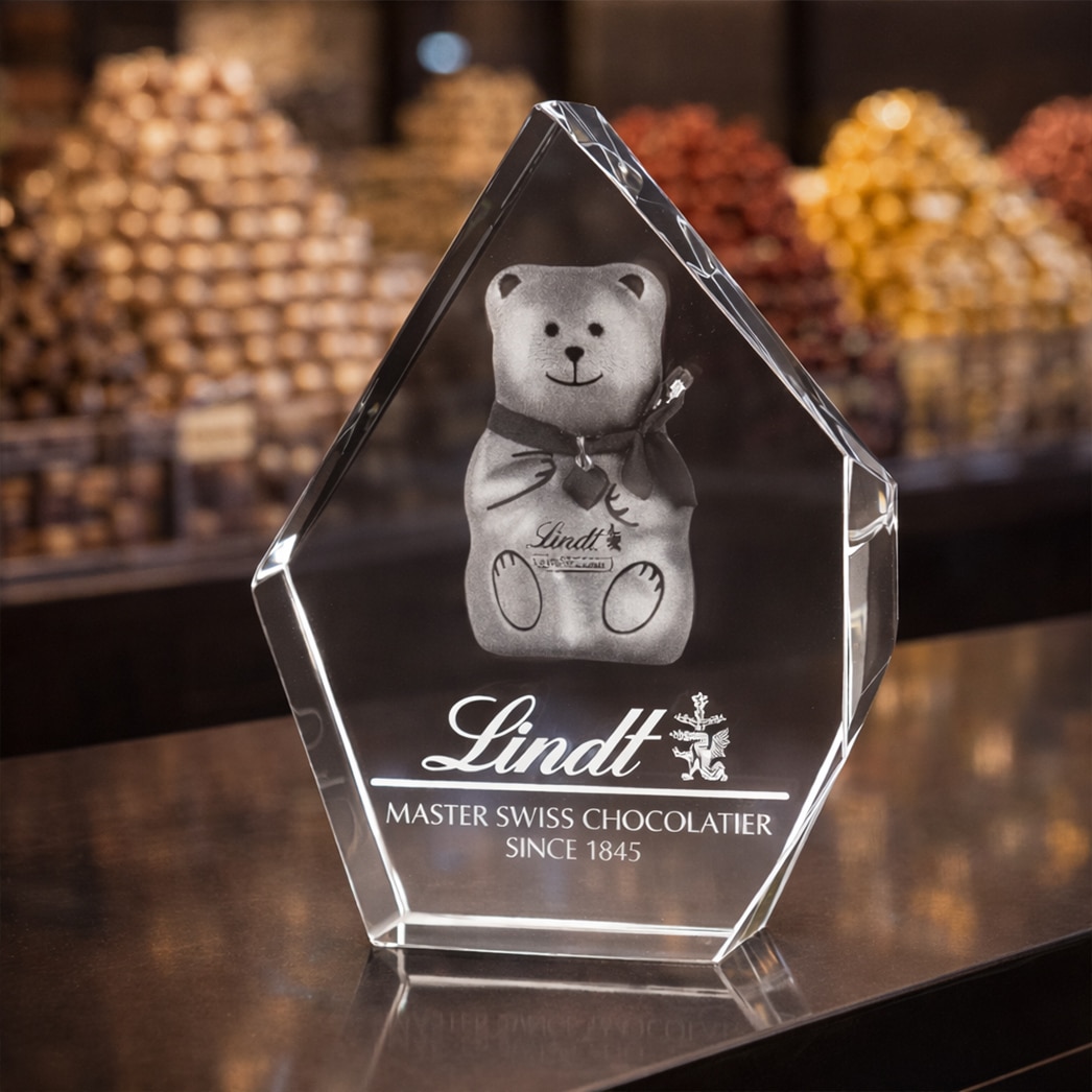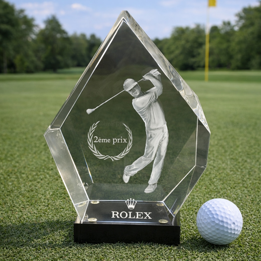 Sa forme moderne et facettée reflète la lumière avec élégance, tandis que la gravure laser 3D semble flotter au cœur du bloc, créant un effet spectaculaire et prestigieux.